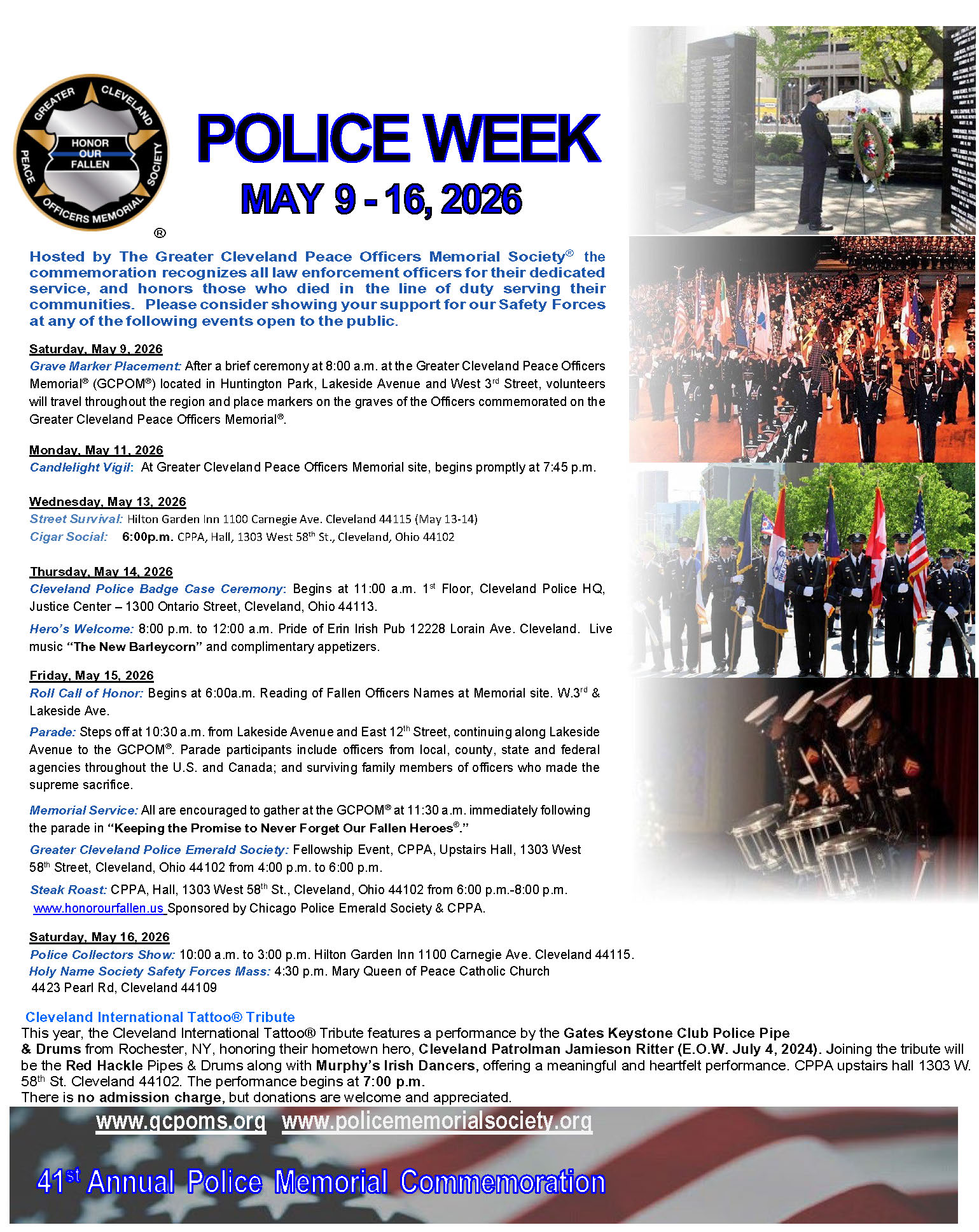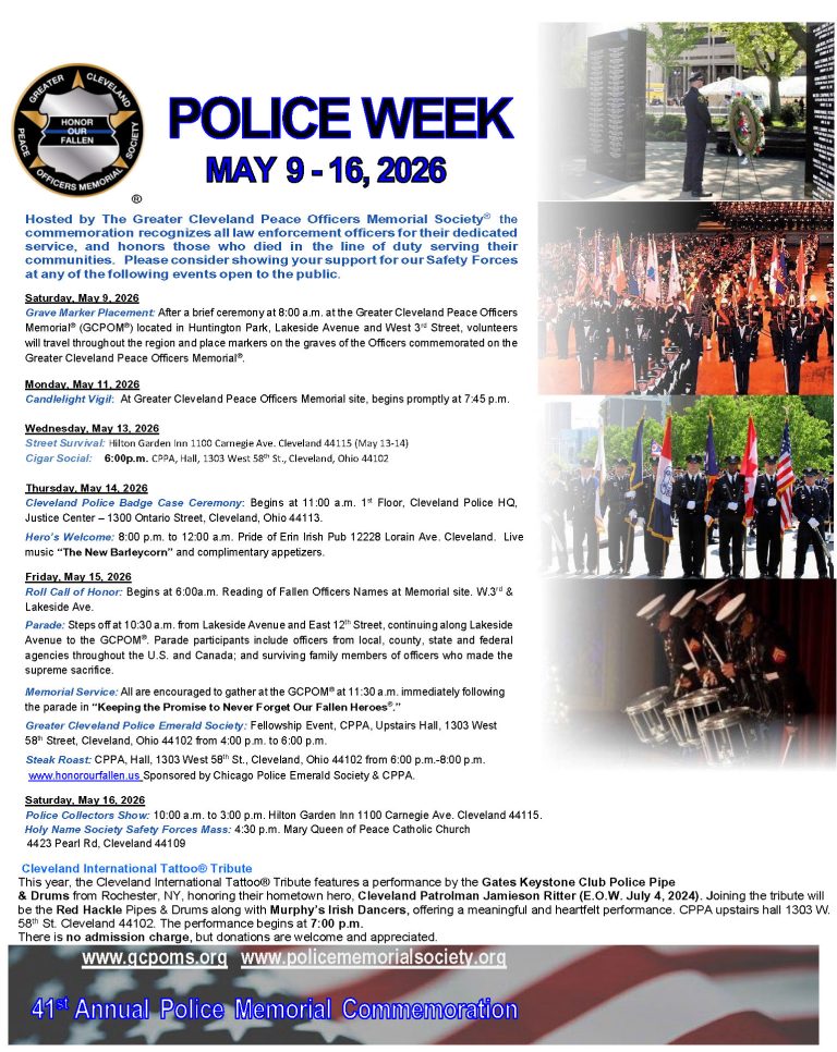 Each year in May, the Police Memorial Society remembers fallen officers during the Greater Cleveland Police Memorial Commemoration, a schedule of events for family, friends and the entire community. The 40th Annual Greater Cleveland Peace Officers Memorial Society Commemoration will coincide with Police Week in 2025. Events include: